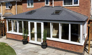 A large Pewter Grey conservatory roof using TapcoSlate Classic tiles & ridge, and adorned with Velux roof windows, built by Regency Conservatory Roofs Ltd of Thornton: (www.conservatoryroofsblackpool.co.uk)