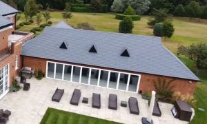 Covered swimming pool adjoining a house in the UK using TapcoSlate 804 Pewter Grey slates and ridge caps. Images curtesy of Rathbone Miller Architects. (www.rathbonemiller.co.uk)